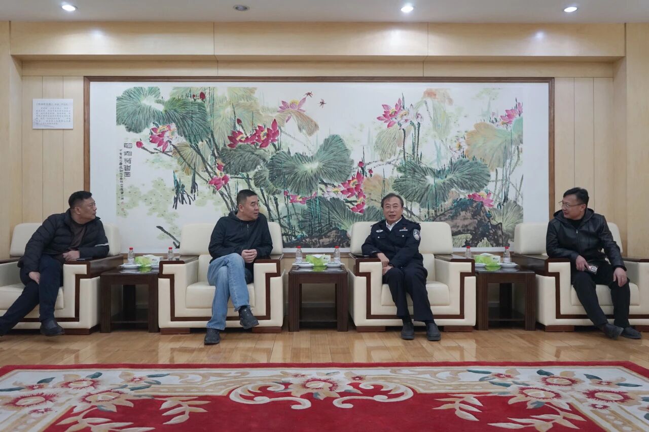 在历下公安分局,王昕总裁与局领导、一级高级警长王立刚亲切交谈,汇报春节期间相关工作部署。